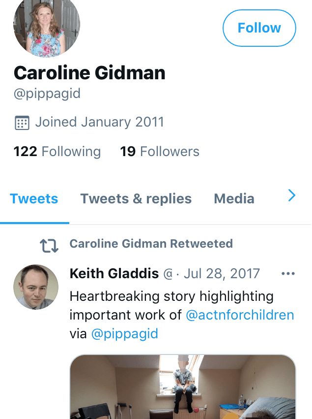 Caroline Gidman wants everyone to think her rich white husband is a hero working for children’s charities. She started a Twitter account pretending to be independent from him to “promote his work” for poor children.